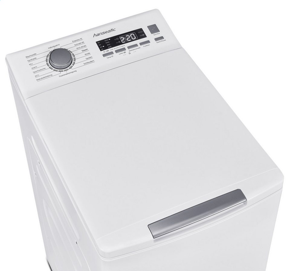 Die Toplader-Waschmaschine HTW7512A von Hanseatic glänzt durch eine überzeugende Ausstattung. Die Energieeffizienzklasse A (Skala: A bis G) zeichnet diese Toplader-Waschmaschine als besonders energiesparendes Modell aus. Mit 7,5 kg Fassungsvermögen eignet sich der Toplader vor allem für . Außerdem hält die HTW7512A Toplader-Waschmaschine folgende Besonderheiten bereit: Kindersicherung und Schaumsensor. Der Schaumsensor legt einen extra Spülgang ein, sodass keine Waschmittelrückstände in den Textilien bleiben, selbst wenn einmal zu viel Waschmittel in der Trommel ist. Über die Startzeitvorwahl lässt sich einstellen, wann die HTW7512A Toplader-Waschmaschine mit dem Waschen anfängt. Das ist insbesondere dann nützlich, wenn die Wäsche fertig sein soll, sobald man nach Hause kommt. Die verbleibende Programmdauer wird auf der Restlaufanzeige dargestellt. So weiß man immer, wie lange die Toplader-Waschmaschine noch für den Waschgang benötigt. Dank des modernen Wasserschutzsystems "Aqua Stop Sicherheitsschlauch" beugt die HTW7512A Toplader-Waschmaschine Wasserschäden vor. Die Abmessungen der Toplader-Waschmaschine betragen 40 cm x 88 cm x 61 cm (BxHxT).